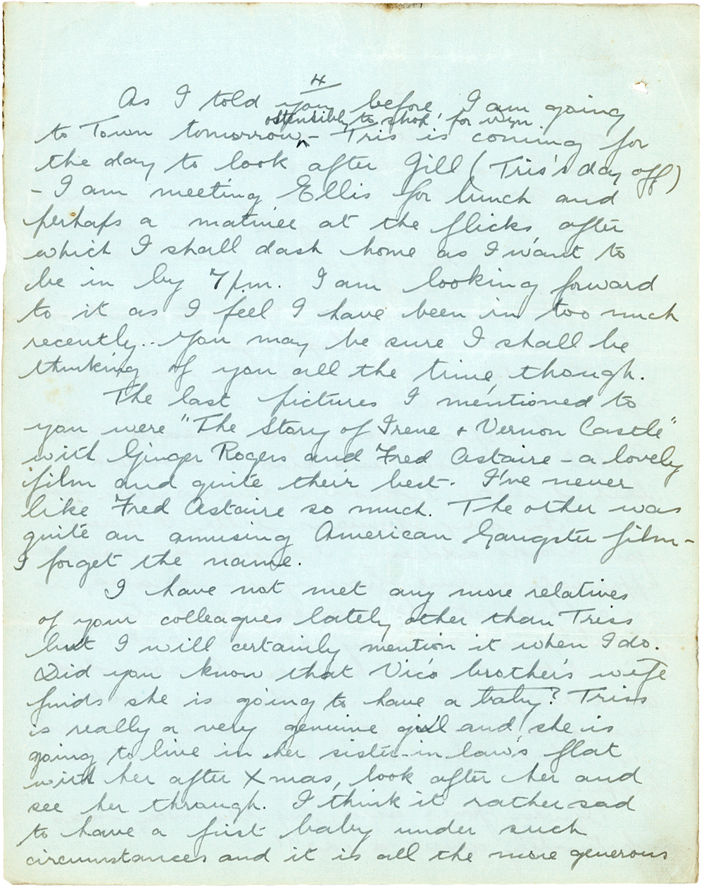 As I told you before I am going to Town tomorrow, ostensibly to shop for Wyn. Tris is coming for the day to look after Jill (Tris’s day off) I am meeting Ellis for lunch and perhaps a matinee at the flicks after which I shall dash home as I want to be in by 7 p.m. I am looking forward to it as I feel I have been in too much recently. You may be sure I shall be thinking of you all the time though.