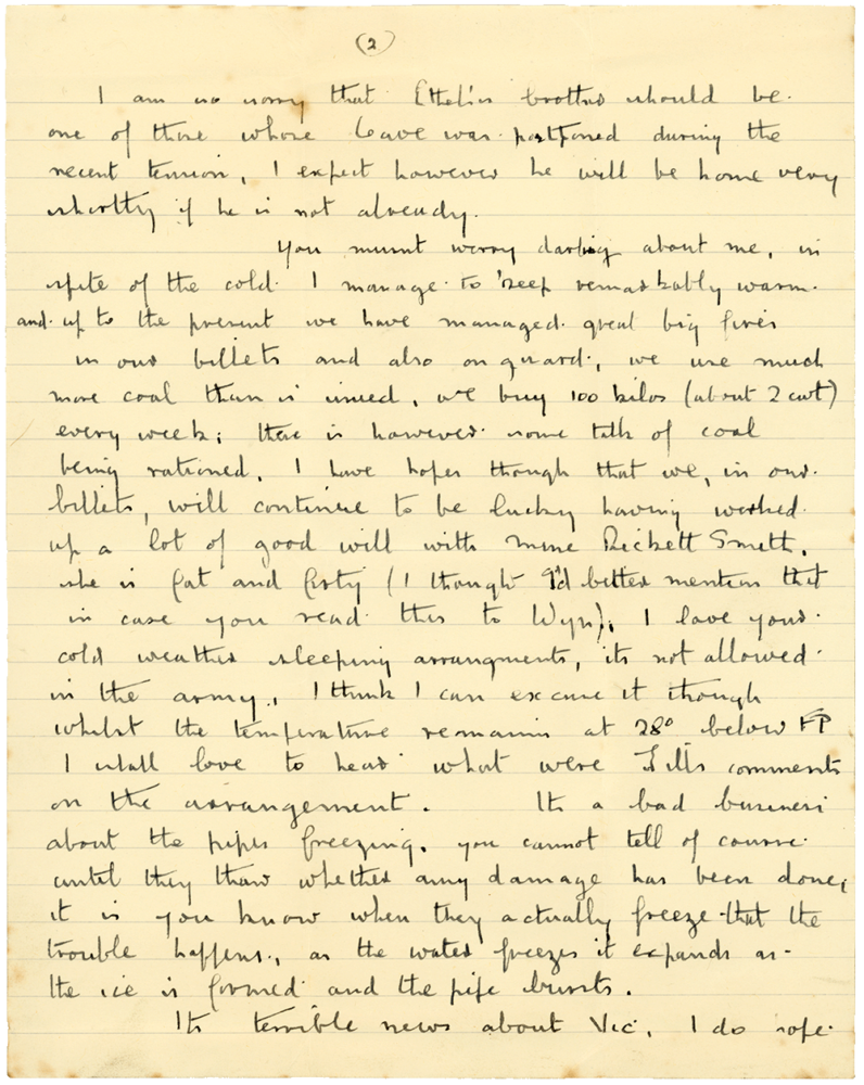You musn’t worry darling about me. In spite of the cold I manage to keep remarkably warm and up to the present we have managed great big fires in our billets and also on guard. We use much more coal than is issued. We buy 100 kilos (about 2 cwt) every week. There is however some talk of coal being rationed. I have hopes though that we in our billets will continue to be lucky having worked up a lot of good will with Mme. Rickett Smith. She is fat and forty (I thought I’d better mention that in case you read this to Wyn).