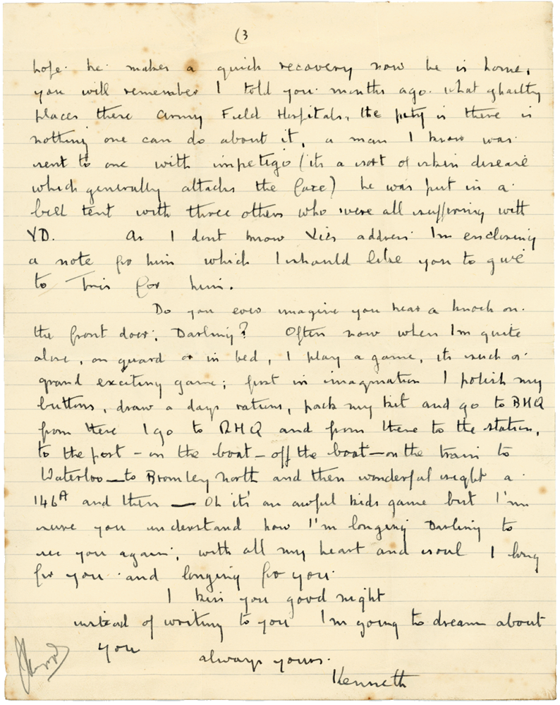Do you ever imagine you hear a knock on the front door Darling? Often now when I’m quite alone, on guard or in bed, I play a game. It’s such a grand exciting game. First in imagination I polish my buttons, draw a days rations, pack my kit and go to BHQ. From there I go to RHQ and from there to the station, to the port—on the boat—off the boat—on the train to Waterloo—to Bromley North and then, wonderful sight, a 146A and then… Oh it’s an awful kids game but I’m sure you understand how I’m longing Darling to see you again. With all my heart and soul I long for you, and longing for you.