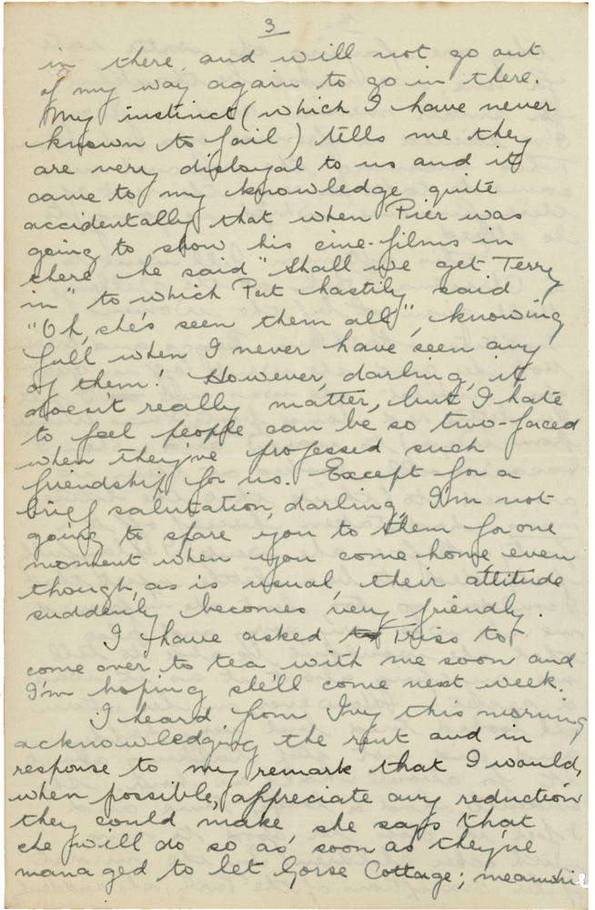My instinct (which I have never known to fail) tells me they are very disloyal to us, and it came to my knowledge quite accidentally that when Pier was going to show his cine-films in there he said “Shall we get Terry in” to which Pat hastily said “Oh, she’s seen them all” knowing full when I never have seen any of them!