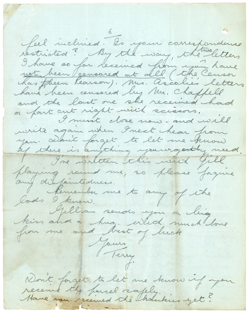 …feel inclined. Is your correspondence restricted? By the way the two letters I have so far received from you have not been censored at all (the censor has been Pearson) Mrs Ascoli’s letters have been censored by Mr Chappell and the last one she received has a part cut right out with scissors.