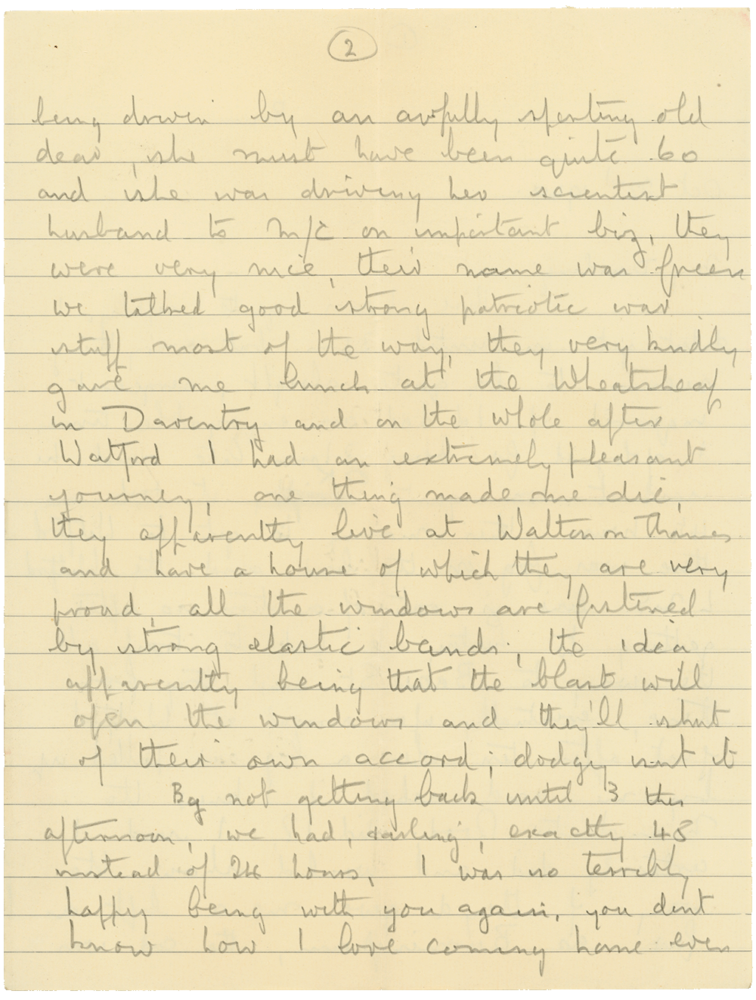 …being driven by an awfully sporting old dear, she must have been quite 60 and she was driving her scientist husband to M/c on important biz. They were very nice, their name was Green we talked good strong patriotic war stuff most of the way. They very kindly gave me lunch at the Wheatsheaf in Daventry and on the whole after Watford I had an extremely pleasant journey. One thing made me die, they apparently live at Walton-on-Thames, and have a house of which they are very fond. All the windows are protected by strong elastic bands, the idea apparently being that the blasts will open the windows and they’ll shut of their own accord. Dodgy isn’t it.